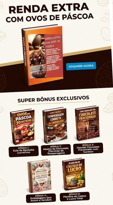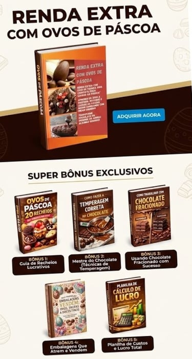 Na compra do ebook RENDA EXTRA COM OVOS DE PÁSCOA, você receberá totalmente GRÁTIS, estes 5 BÔNUS exclusivos, que vão te ensinar a ganhar dinheiro o ANO TODO.
